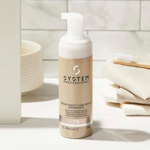 Hair is up to 10 times more sensitive to damage when it is wet. When exposed to heat the hair needs protection against heat and mechanical damage during the blow-dry. System Professional Repair Perfect Hair provides hair with volume and improves its structure. The leave-in foam deeply strengthens the hair fiber. Hydrolized keratin and amino acids penetrate the porous zones of the hair structure and restructure the damaged area. The protective polymers of the Thermo-Resist formula make the hair more resistant against the effects of heat for strong and resilient hair.