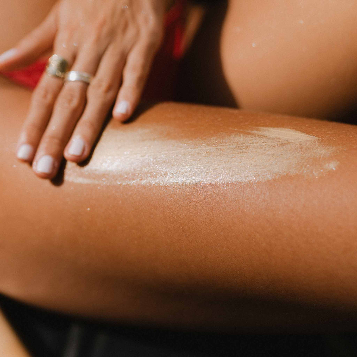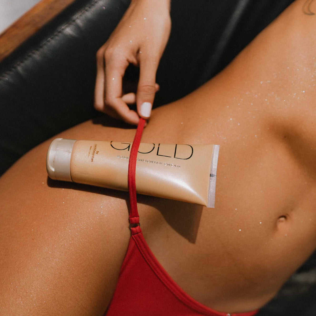 Apply desired amount of Hydrating Gold Body Highlighter Cream onto the skin and blend in with your hands or body blending brush in long sweeping motions.