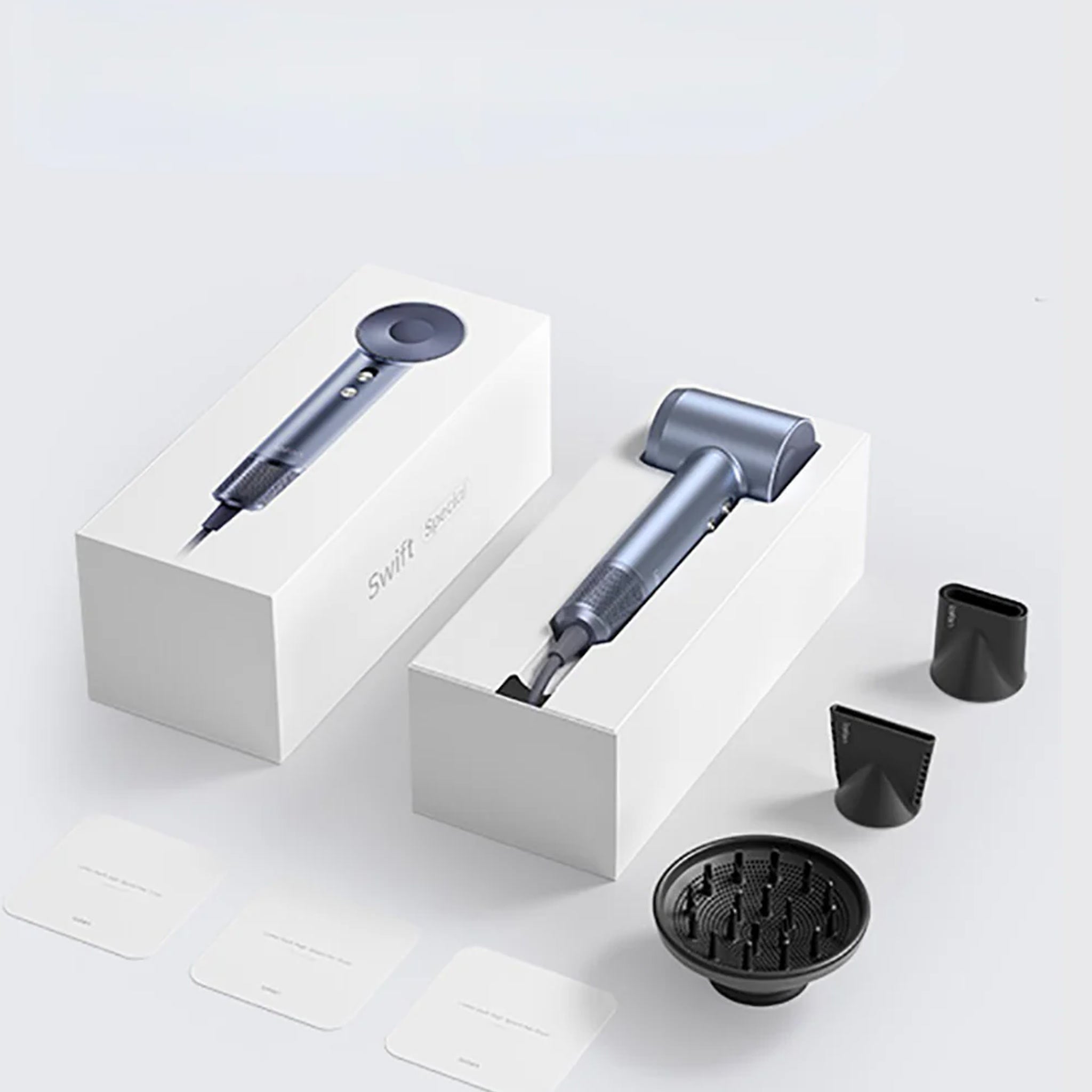 The Swift is equipped with an intelligent thermo-sensor, which monitors and adjusts air temperature over 100 times per second. The faster air speed means that temperature can be limited to 80ºC, so hair dries healthier too. It even features an innovative Temperature Cycling Mode, which automatically adjusts temperature to protect your hair and lock in more style. Plus, Swift Ionic Boost technology generates millions of negative ions, eliminating static for the most naturally supple, smooth and shiny hair.