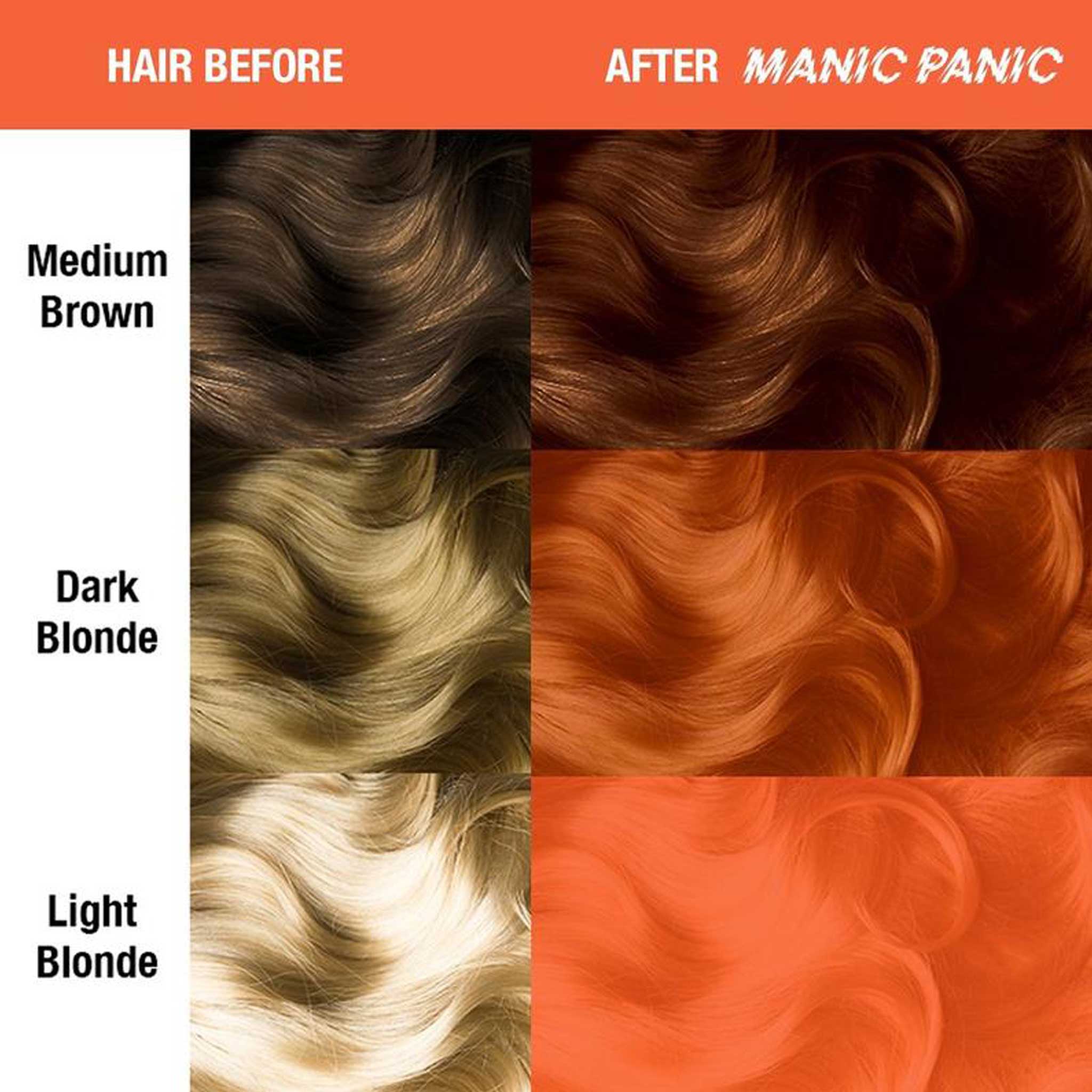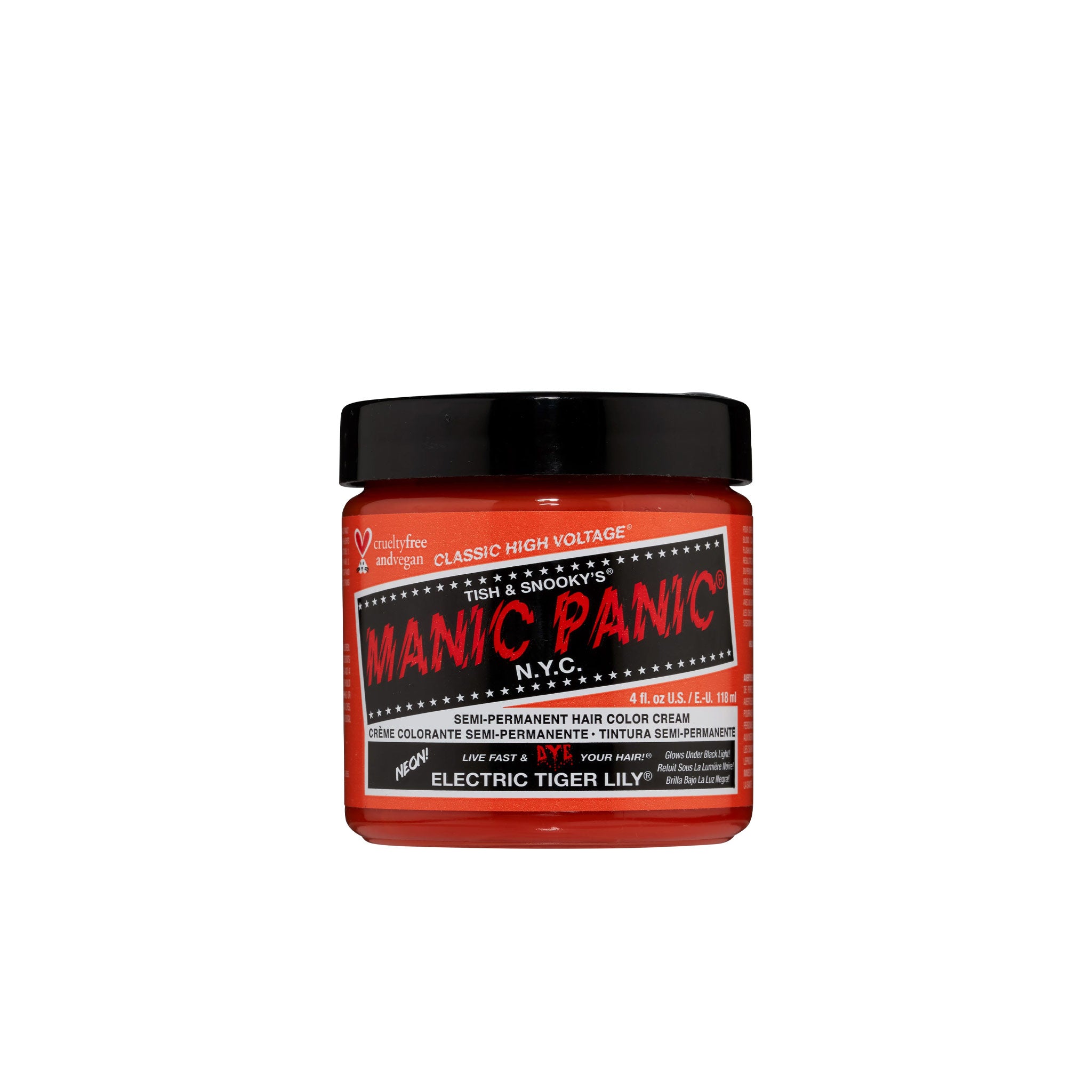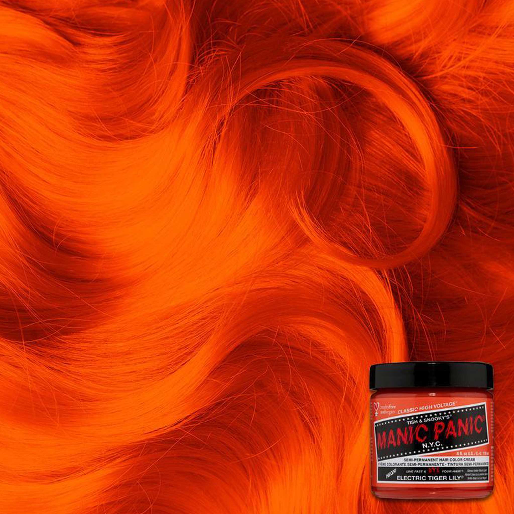 • Manic Panic Electric Tiger Lily is a bright orange semi-permanent hair dye. This High Voltage orange shade is sure to help you express your alternative fashion whether you are pairing it with other colours or creating a whole head of orange hair.