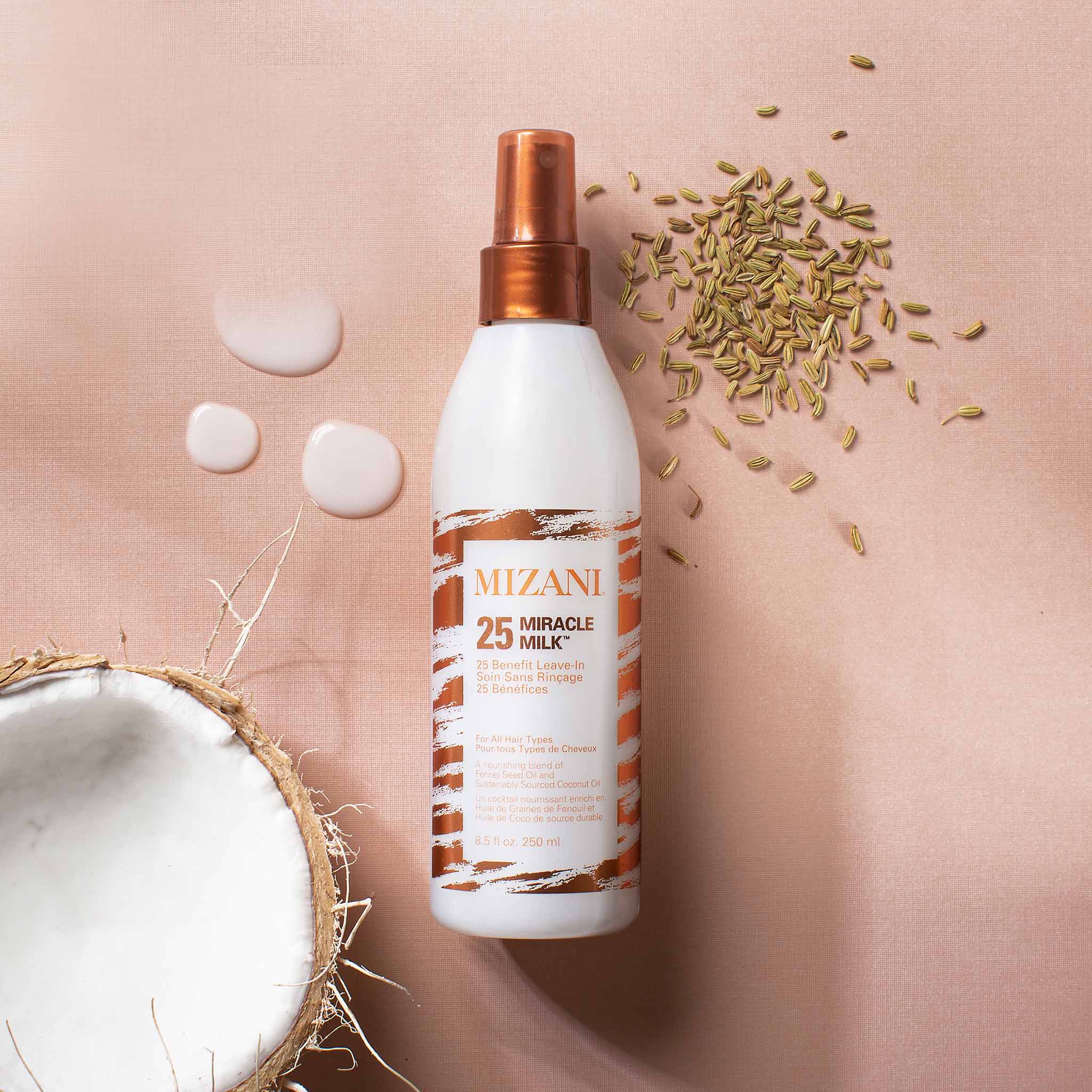 • Mizani 25 Miracle Milk 250mlis a nourishing leave-in conditioner that provides a protective shield against heat damage and primes all texture types for a perfect frizz-free finish. With an unbeatable blend of transformative ingredients such as fennel seed oil and coconut oil, this leave-in conditioner penetrates deep down to the follicle to prep, protect and moisturize hair for superior detangling and hydration. The unique formula undoes damage and treats dryness to control frizz and create soft, lustrous hair.