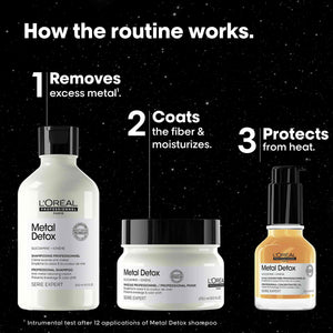 Apply shampoo evenly on wet hair. Lather until a rich foam is obtained. Rinse. Use weekly in alteration with your Serie Expert shampoo. Follow with the Metal Detox mask. Leave on for 1 minute. The texture is light to touch & easy to apply. Apply oil daily on dry or towel-dried hair. Warm 1 or 2 pumps in the palm & spread evenly from mid-lengths to ends. Do not rinse. Proceed to blow-dry or air-dry.