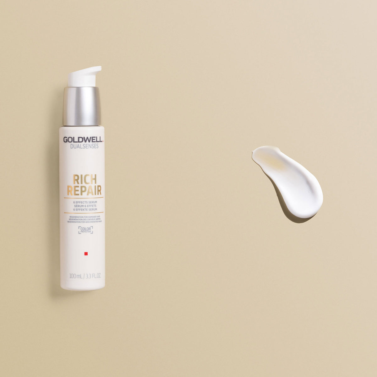 Goldwell Dualsenses Rich Repair 6 Effects Serum 100ml will work to restore and repair severely damaged hair from deep inside and will also bring out the natural shine.