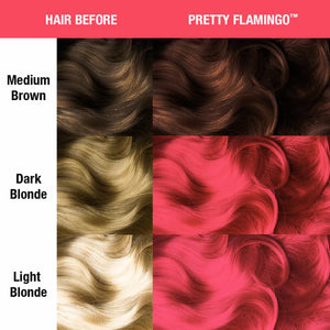 • Pretty Flamingo is warm pink hair dye with orange undertones. Pretty Flamingo glows under blacklights, so we recommend lightening hair to the lightest level 10 blonde before use.