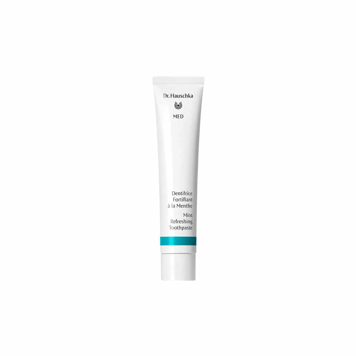 Dr. Hauschka MED Mint Refreshing Toothpaste cleanses thoroughly and prevents the build-up of tartar and plaque. The formulation contains carefully selected medicinal plant extracts, natural essential oils and mineral cleansing agents that ensure the thorough removal of plaque and stabilise the flora of the oral cavity. White clay and diatomaceous earth provide double-strength natural cleansing and are combined with mineral-rich water to form the basis of this well-tolerated toothpaste. Extracts of neem leaves, horse chestnut and mastic – a common ingredient in traditional dentistry – stabilise and care for the oral cavity. Antimicrobial essential oils from peppermint, clove and chamomile have anti-inflammatory properties and provide long-lasting fresh breath. Dr. Hauschka MED Mint Refreshing Toothpaste contains no added fluorides or surfactants. The product’s effectiveness is clinically proven.