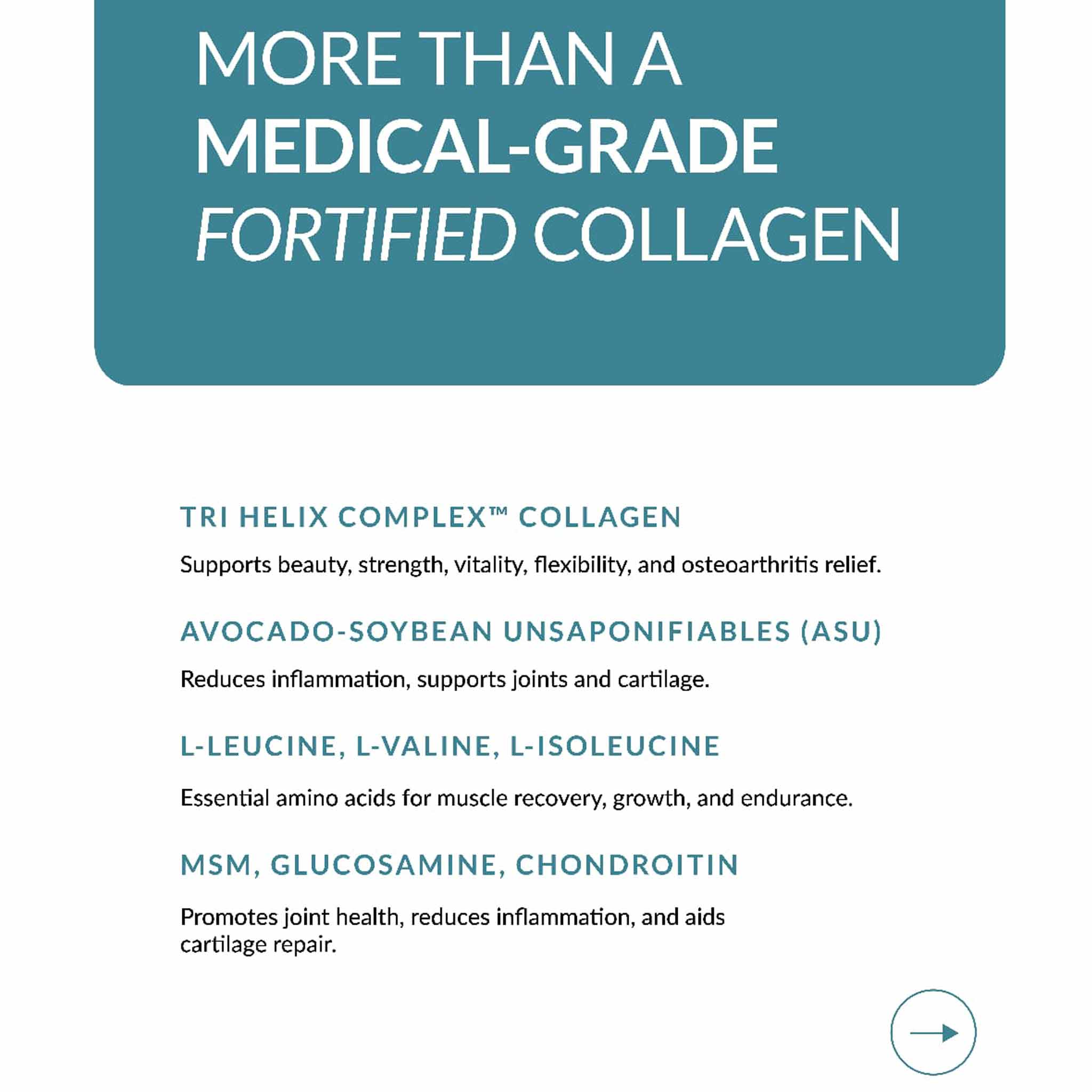 • Avocado-Soybean Unsaponifiables (ASU) 30% Sterols: Reduces inflammation, supports joint health and cartilage repair.