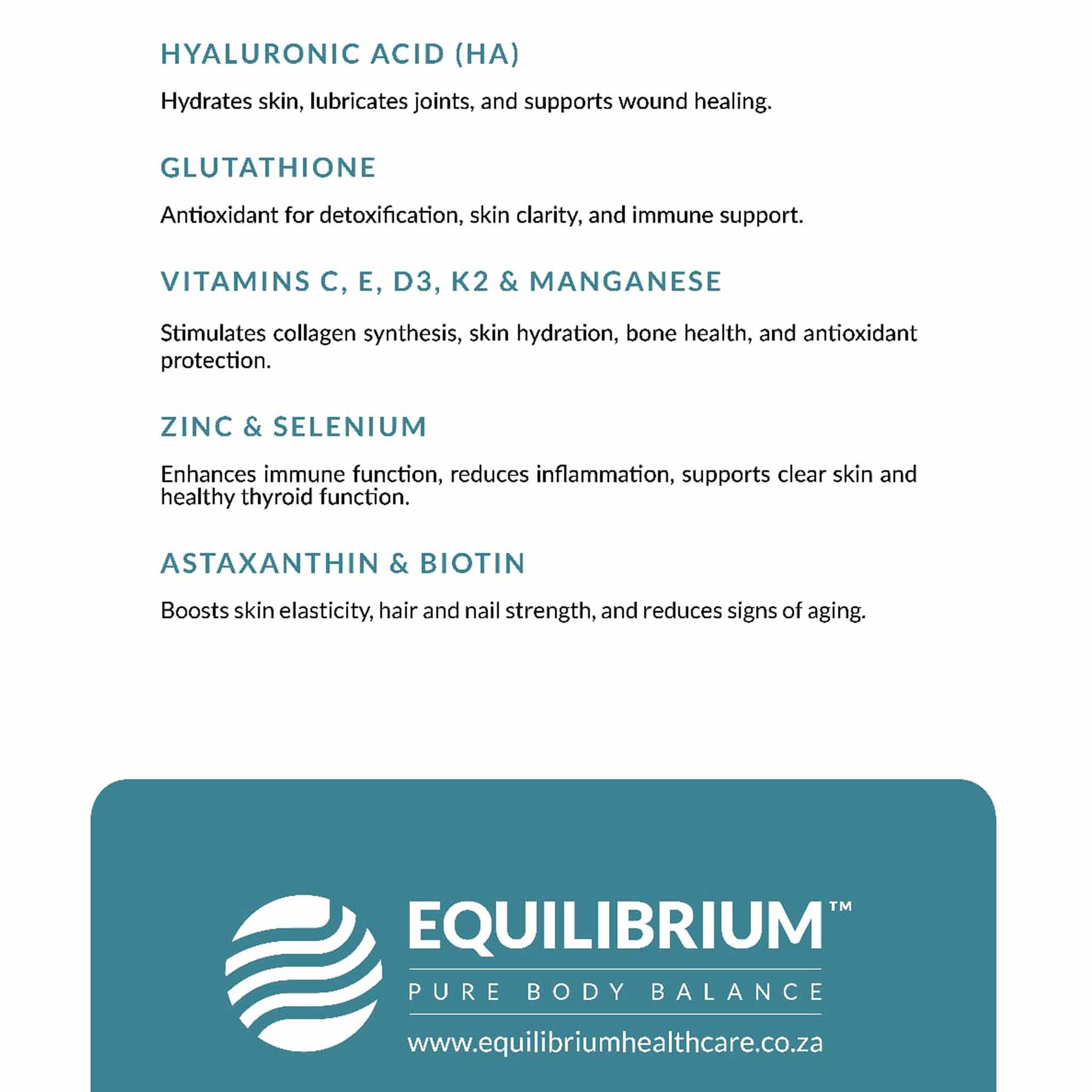 • Vitamin C (Ascorbic Acid): Collagen synthesis, immune support, hydrates and brightens skin.