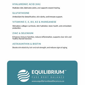 • Glutathione: Antioxidant, reduces blemishes and hyperpigmentation, supports immunity.