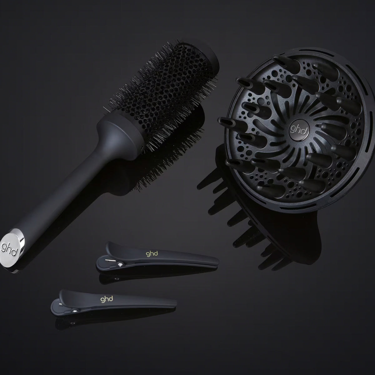 Take your everyday blow-dry to the next level with the ghd air kit®, containing the ghd air® hair dryer, diffuser attachment, ceramic radial brush size 3 and sectioning clips.