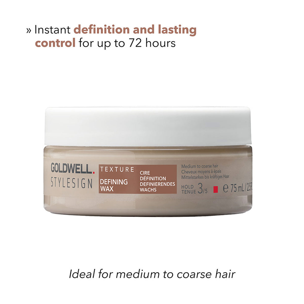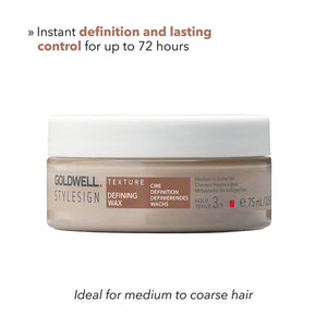 • Goldwell StyleSign Texture Defining Wax provides instant definition and long-lasting control with an ultra-high shine finish for up to 72 hours.