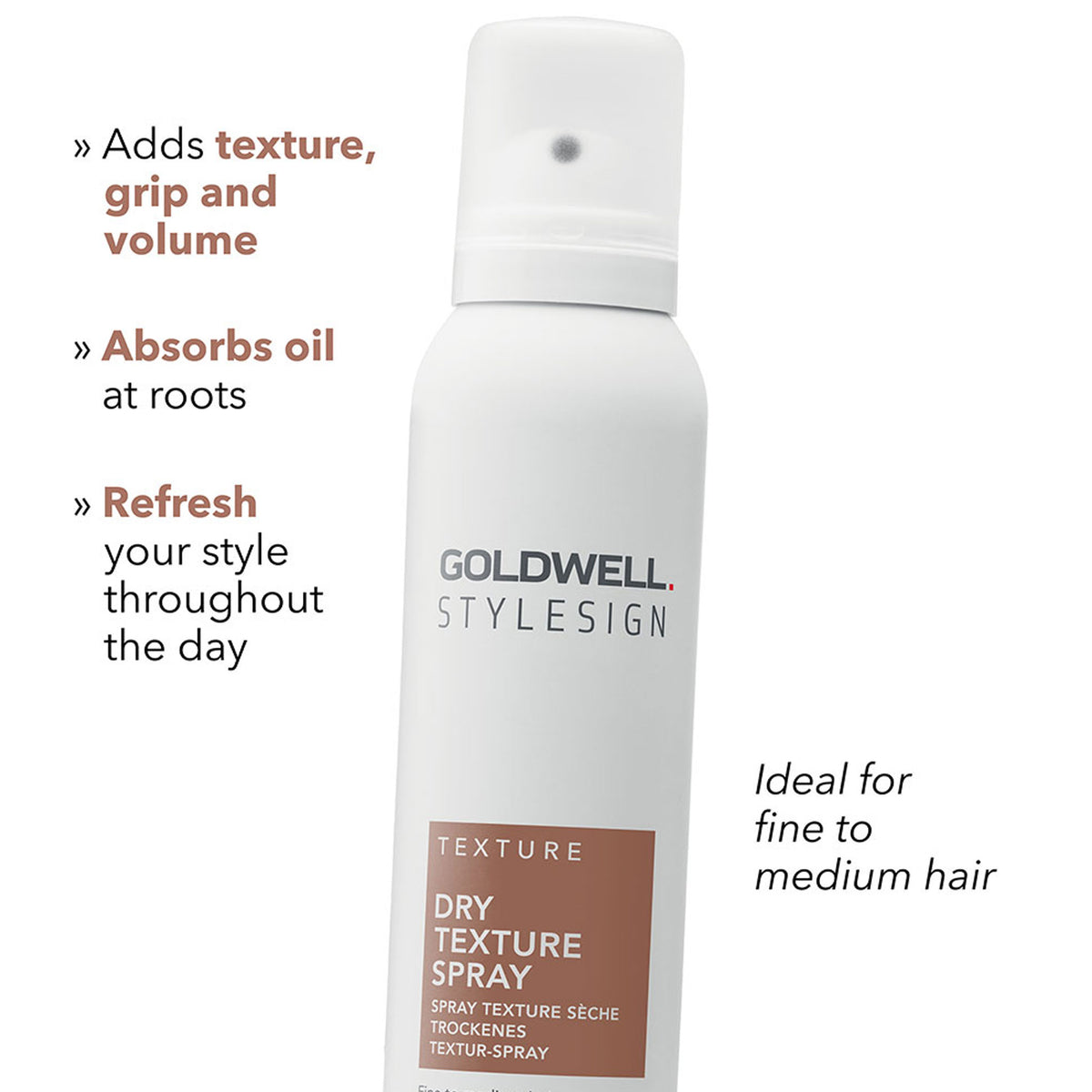 Add strong grip, texture, and volume to your hair with the Goldwell StyleSign Texture Dry Texture Spray.