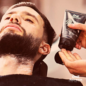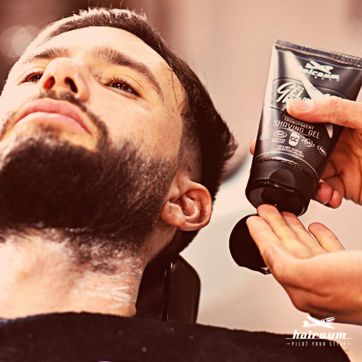 • Apply the Transparent Shaving Gel to the contours of the beard to reshape it. For a complete shave, apply to the entire surface of the skin, emulsify with a little water before shaving.