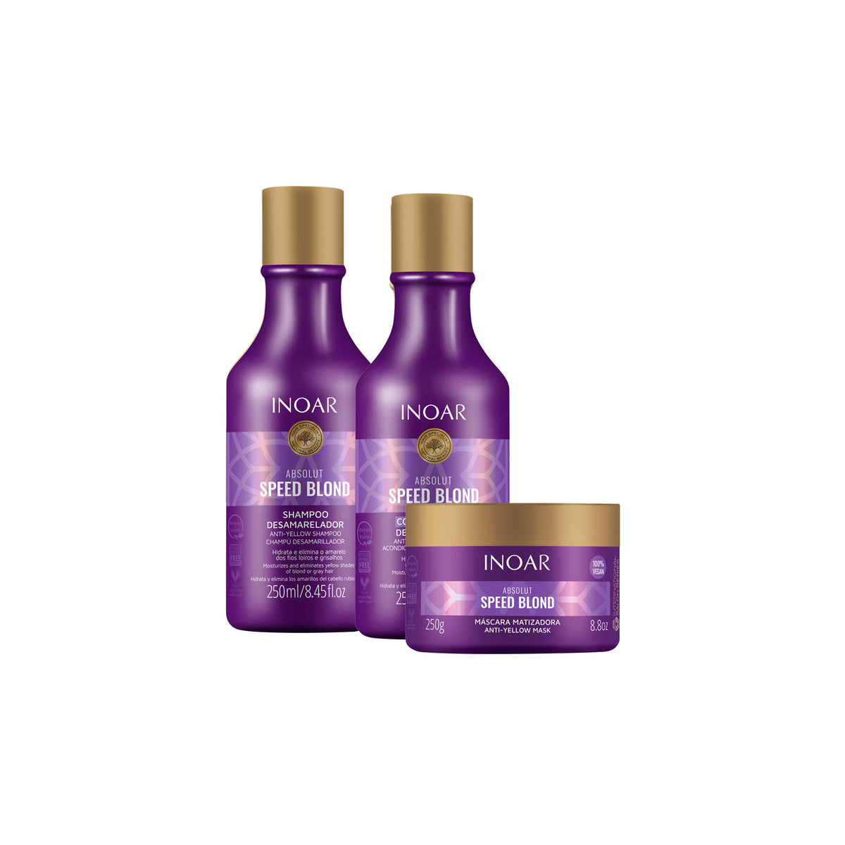 Blonde hair fully reflects the health of the hair fiber. That's why Inoar developed the Absolut Speed Blond line, especially for the daily care of bleached or highlighted blondes. Its formula with argan oil and balanced pH gradually corrects yellowing of the hair, in addition to providing unparalleled hydration, restoring the charming tone and luminosity of well-cared-for blondes.