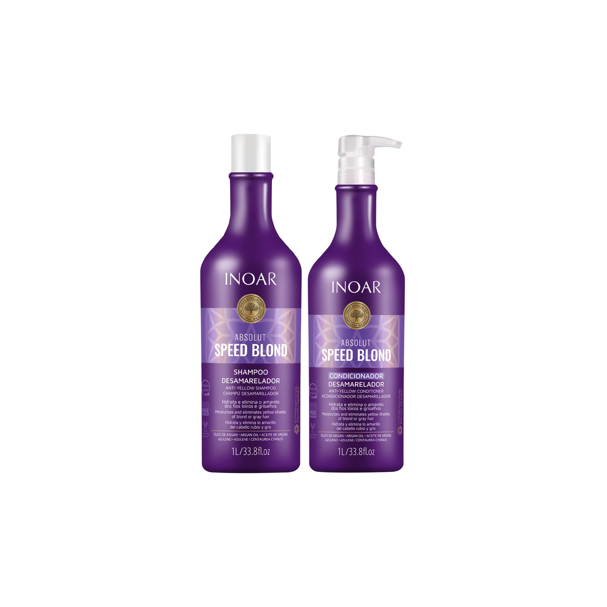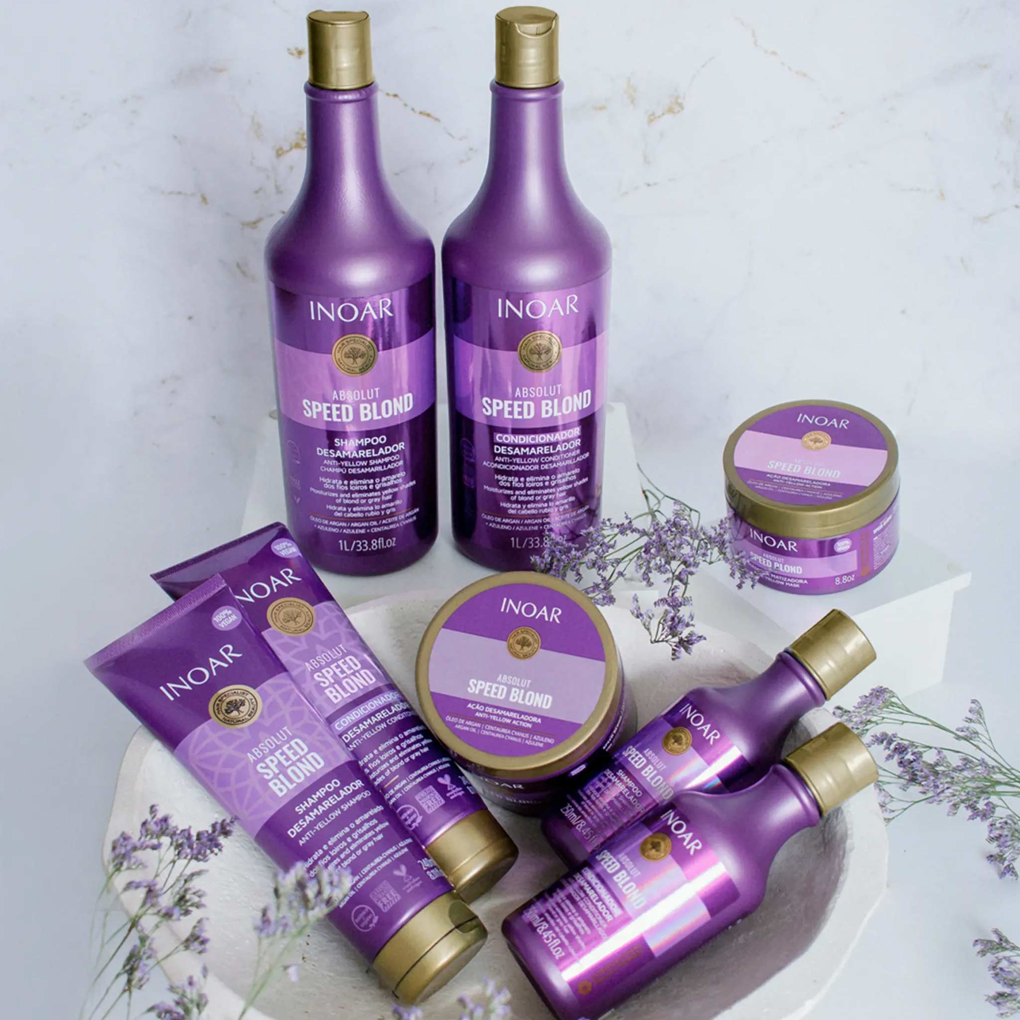 Yellow-neutralizing shampoo for bleached or gray hair. Inoar Absolut Speed Blond cleans and neutralizes yellow tones in hair.