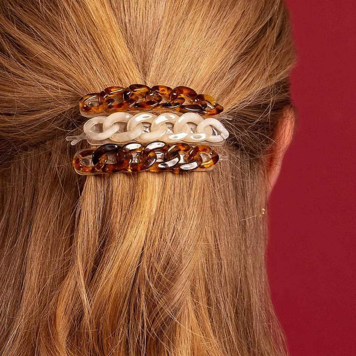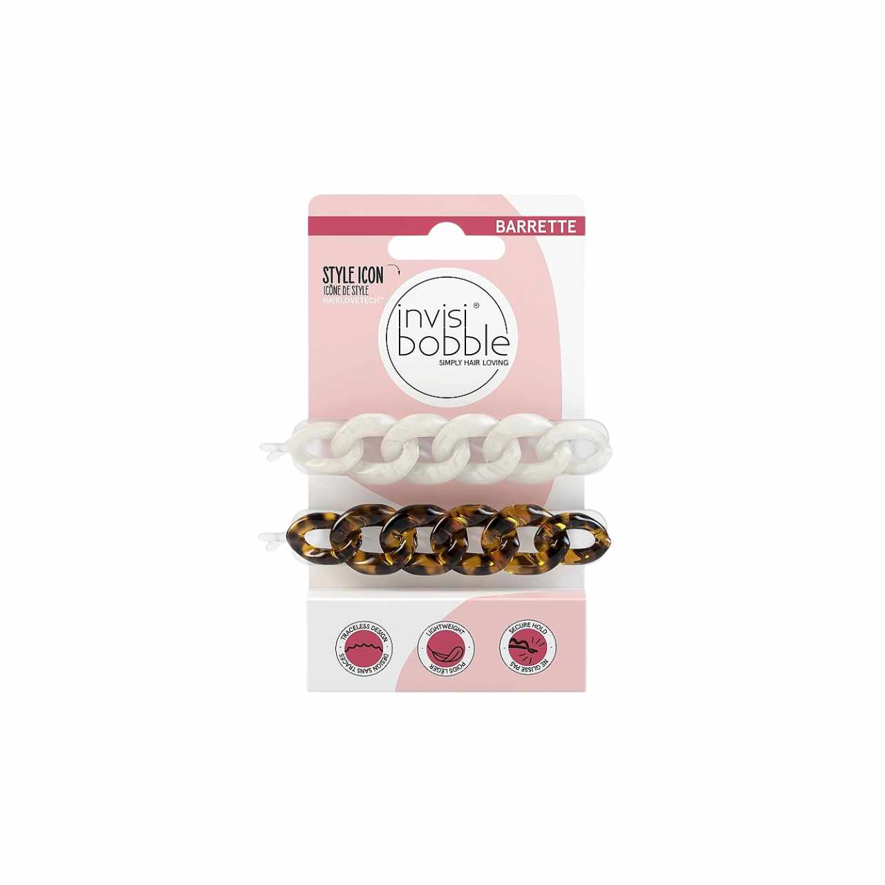 With invisibobble BARRETTE Too Glam to Give a Damn, you always have the perfect hair accessory on hand. This set of two fashionable hair clips with innovative HAIRLOVETECH™ is extra gentle on your tresses and doesn’t cause damage. The barrettes don’t have any metal parts, so they feel lightweight and comfortable in the hair. At the same time, the hair clips by invisibobble provide strong hold and don’t slip out of the hair. The packaging is 100% recyclable.