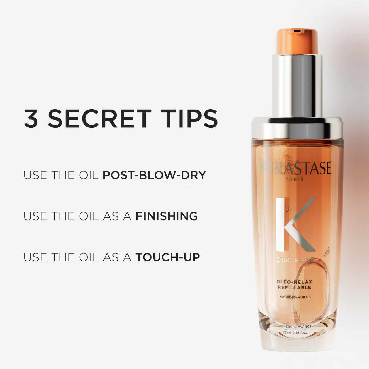 The Kérastase Discipline Oleo-Relax Anti-Frizz Hair Oil 75ml is a control-in-motion oil for voluminous and unruly hair. After a few drops, it provides less frizz, more manageability, and enhanced smoothness.