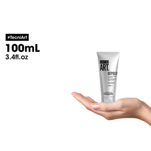 Depolish 100ml is L’Oréal Professionnel’s destructuring and workable paste. The Tecni.ART must-have to deconstruct and mattify hair for a rough, unpolished look you can endlessly remodel.