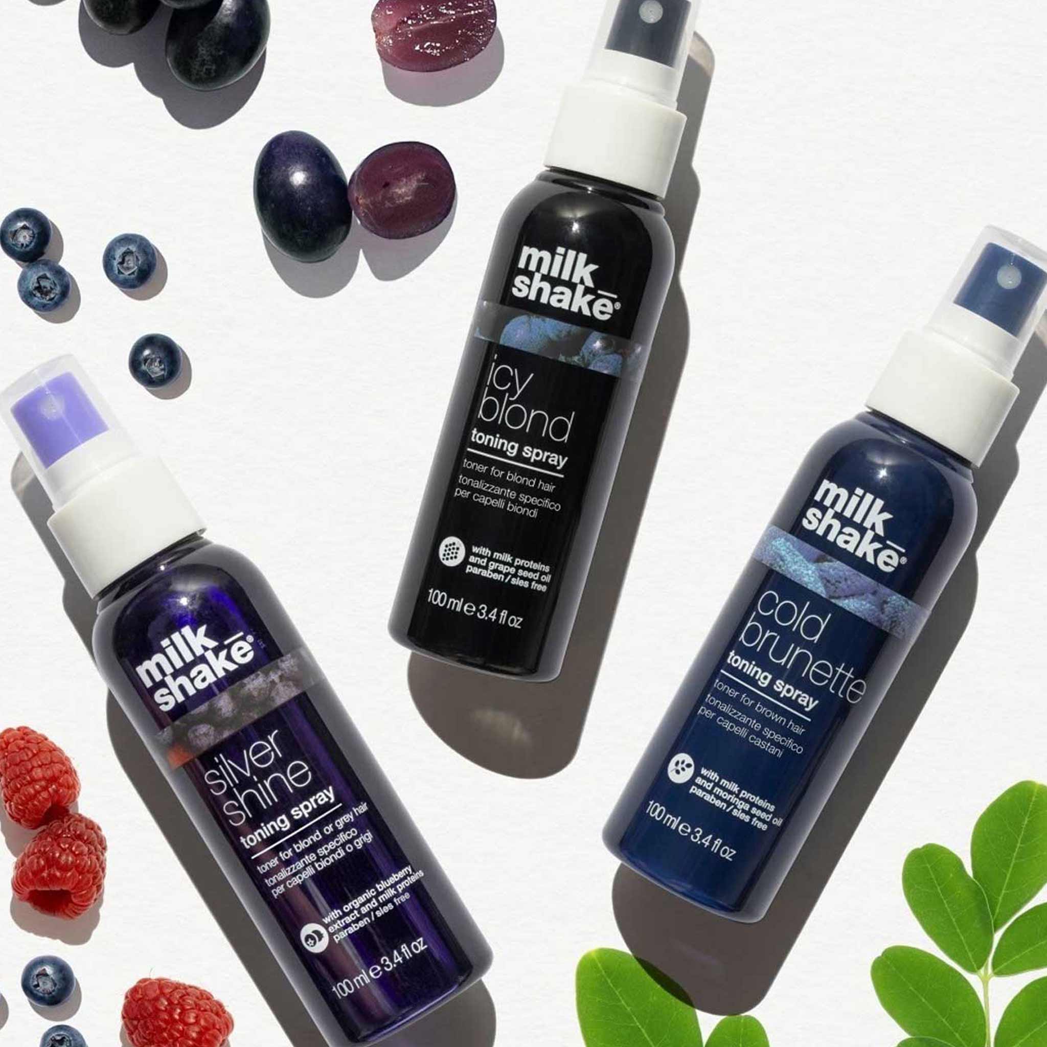Milkshake Icy Blond Toning Spray is a specific toning spray for blond hair. It is a no-rinse spray formulated with a specific black pigment that counteracts brass while depositing ash tones in blond or lightened hair. Gives hair a healthy appearance while detangling and improving manageability.