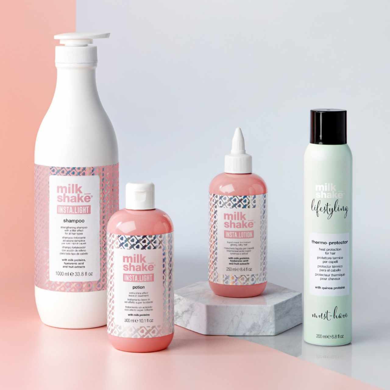 Milk Shake Potion Insta.Light is a leave-in treatment with a super smoothing effect. Its formula is enriched with milk proteins and sweet almond proteins. Its creamy texture, easy to apply, adheres to the hair, sealing it. A real laminating fluid that plumps the hair, making it shiny and voluminous .