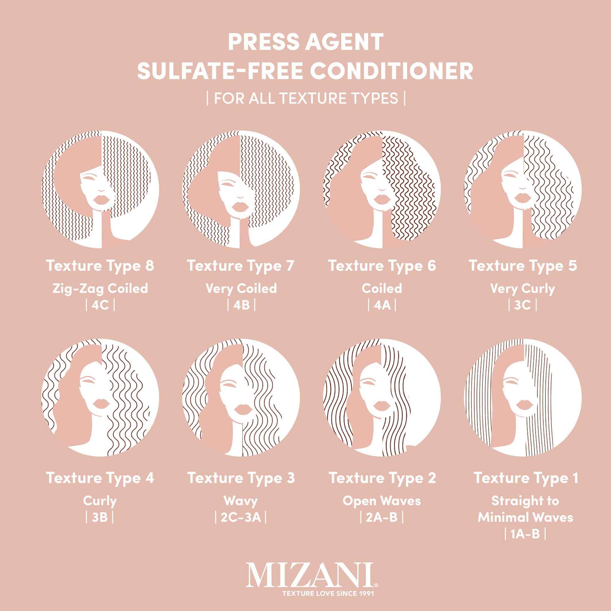 • Mizani Press Agent Conditioner 250ml is a creamy conditioner that preps hair for thermal styling, moisturizes dry, frizz hair and features a melting technology that detangles. This formula includes fragrance notes of sparkling Pink Grapefruit and juicy Mandarin that blend together with a floral medley of Jasmine, Rose & Freesia, ending on notes of Musk & Wood to lock out humidity and help achieve a sleek blowout or silk press.