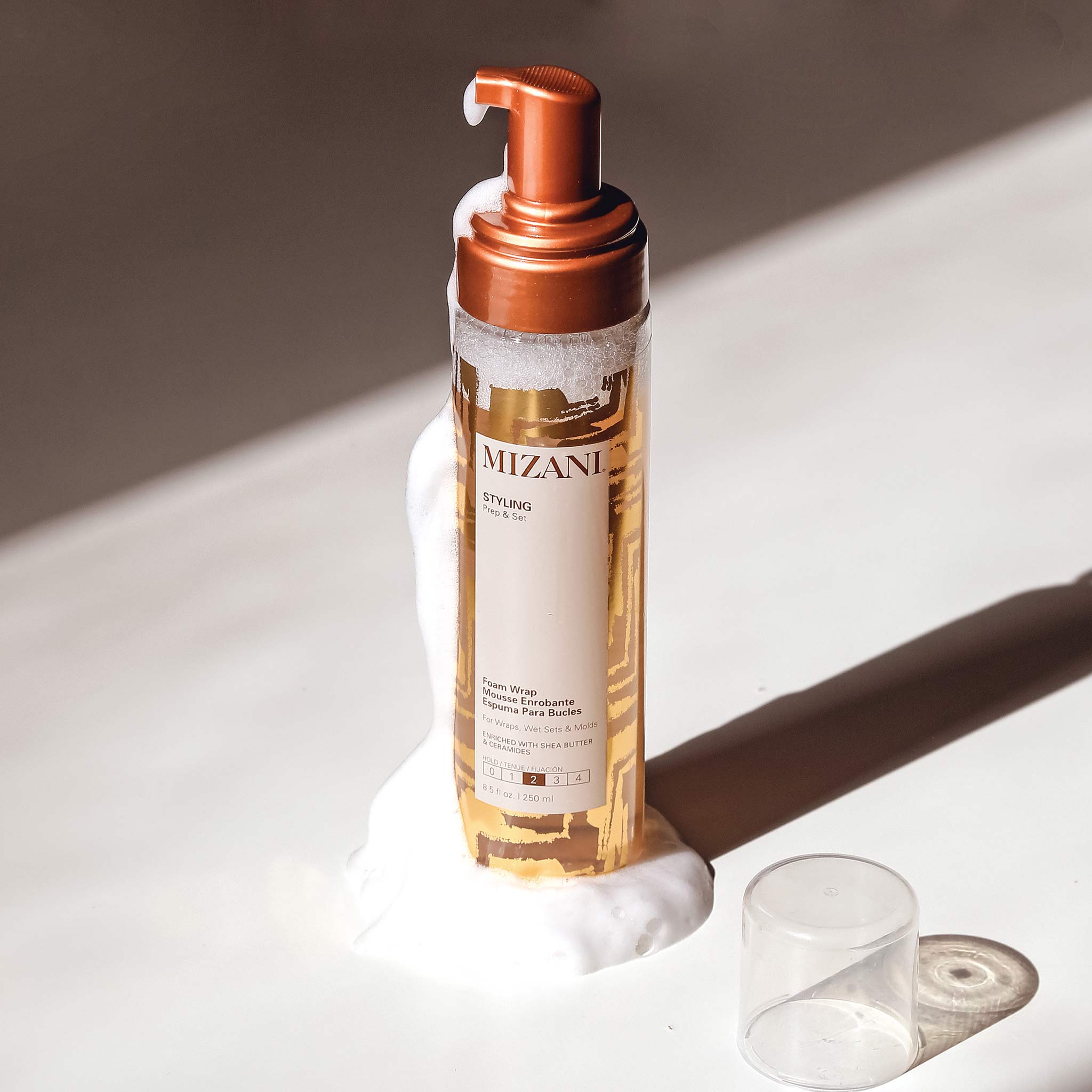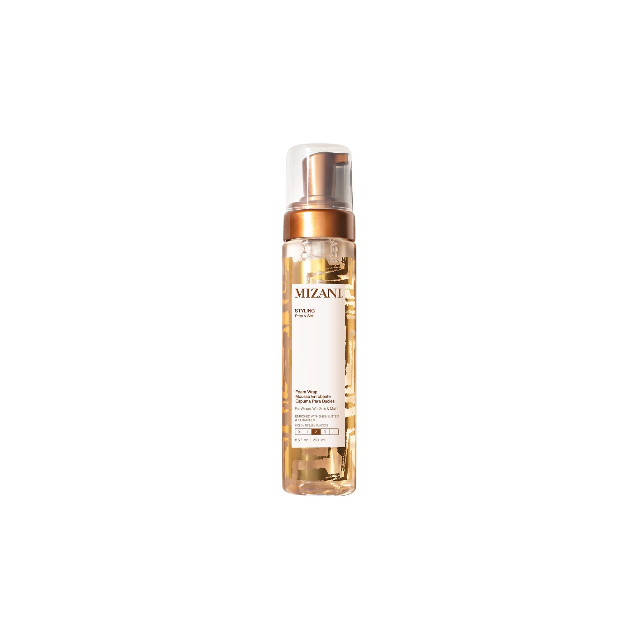 • Mizani Styling Foam Wrap 250ml is a lightweight foaming wrap infused with the nourishing and strengthening properties of monoi oil, shea butter and anti-breakage ceramides. This hair foam keeps styles in place and gives wet sets a flawless finish. Made to moisturize, shape and define hair, this curl gel provides long-lasting hold for a no-fuss style.
