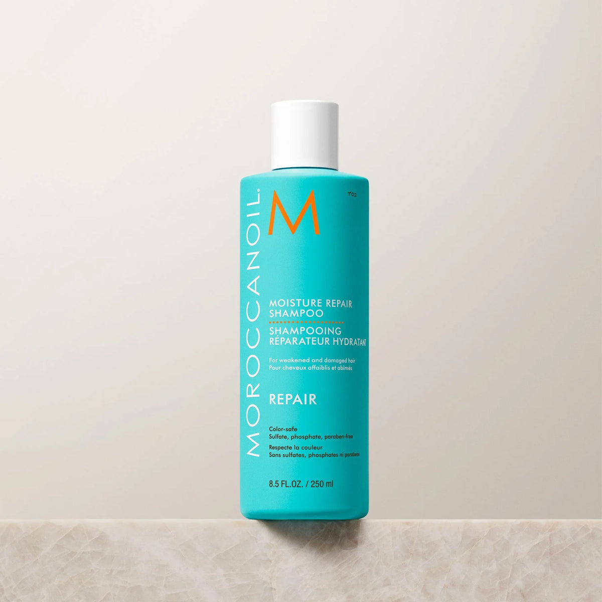 Moroccanoil Moisture Repair Shampoo gently cleanses while infusing hair with argan oil, keratin, fatty acids, proteins and other nutrients. This formula is free of sulfates, phosphates and parabens and is safe for colour treated hair.