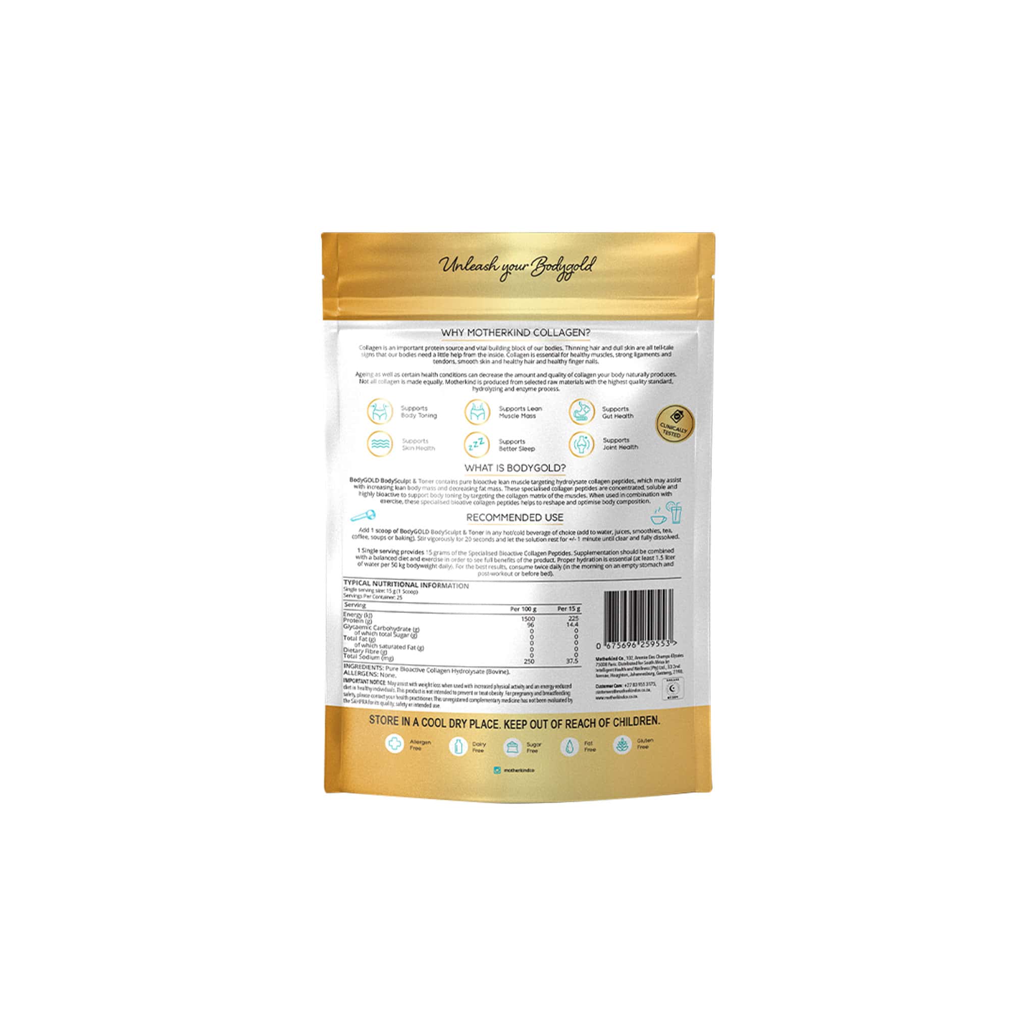 BODYGOLD®️ Natural Bodysculpt & Toner contains bioactive collagen peptides, targeted for increasing lean body mass and decreasing fat mass. These special peptides are concentrated, soluble, highly bioavailable and clinically verified for optimising body toning by stimulating the collagen matrix of the muscles.