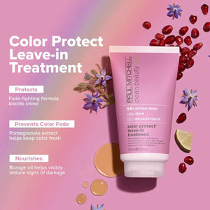 Clean Beauty Color Protect Leave-in Treatment boosts shine and keeps colour fresh for longer. Infused with antioxidant-rich pomegranate extract, known to help prevent colour fade from environmental exposure and free radical damage. Borage oil helps soften, nourish and visibly reduce signs of damage.