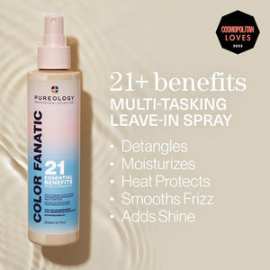 Finish your routine with the Pureology Hair Spray – the Color Fanatic Leave-In Treatment. With 21 benefits, this lightweight spray primes, protects, and perfects all hair types. It moisturises, strengthens, detangles, controls frizz, and adds a luminous shine. Infused with Violet Toning and Pureology’s signature fragrance of pear, rose, and sandalwood, it delivers a salon-quality finish at home.