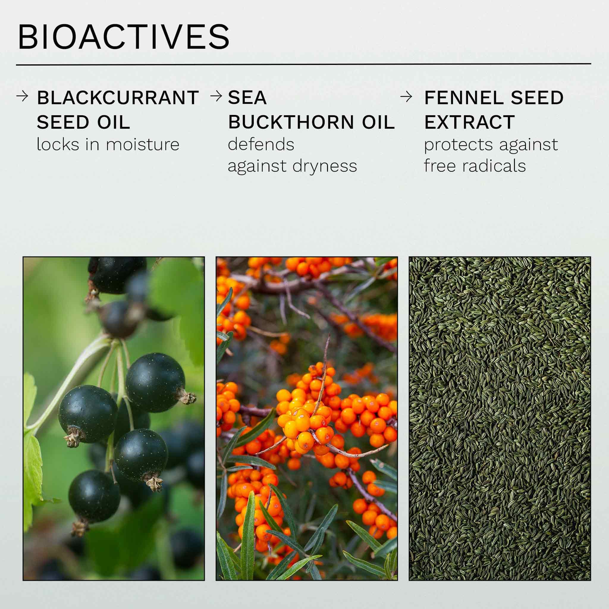 BLACKCURRANT SEED OIL: Extracted from non-GMO Ribes Nigrum plants cultivated in Poland using sustainable supercritical CO2 extraction, Blackcurrant Seed Extract is rich in nutrients and Omega 3 and 6 to help support the skin barrier, locking in moisture and smoothing the appearance of fine lines.